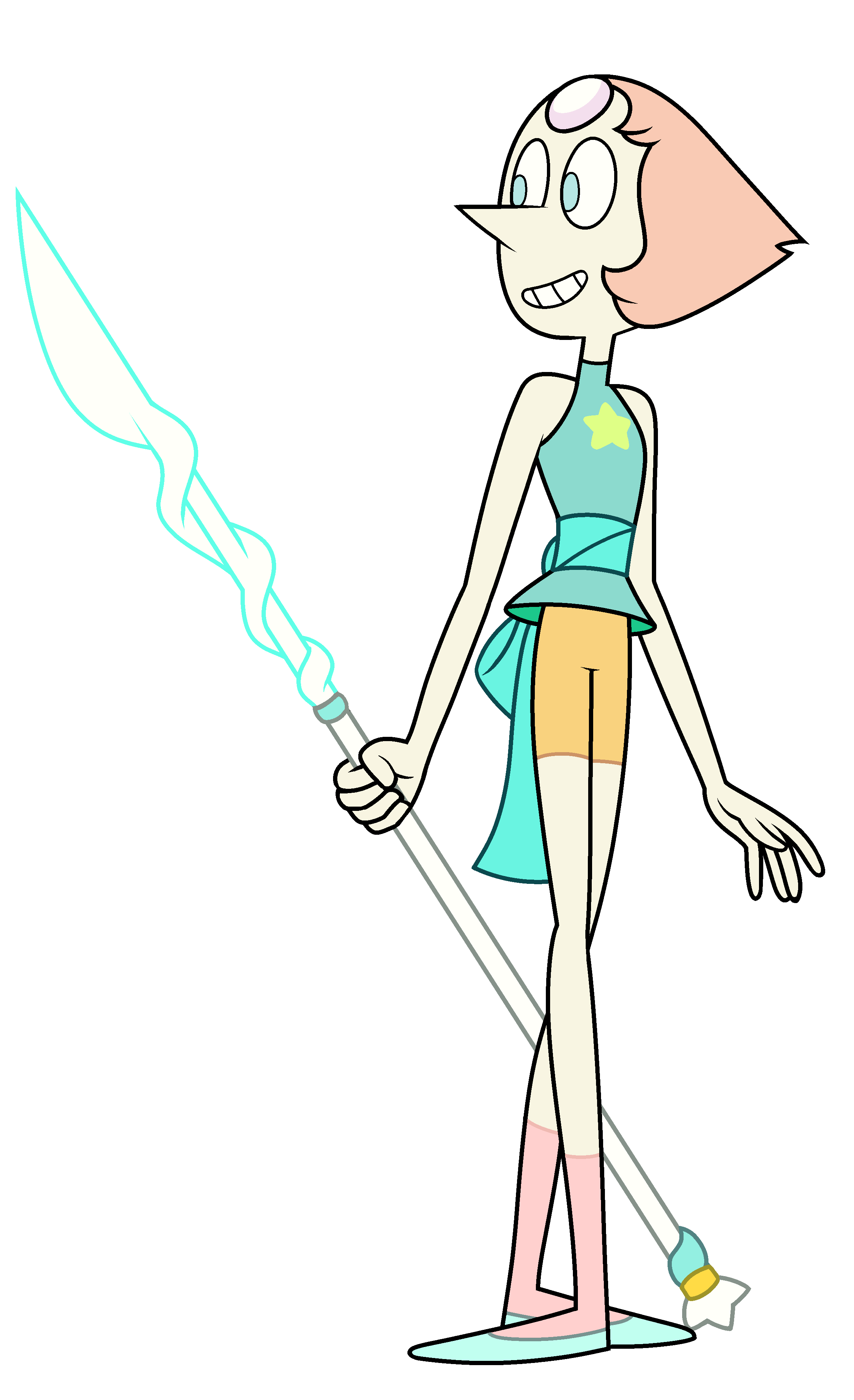 As of "Steven the Sword Fighter", Pearl wears an aqua-blue tunic-leotard with a small gold star on the center of her chest and a lighter satin sash-ribbon around her upper waist. Her leggings are amber-colored. Pearl wears pink socks with pale blue slip-on ballet flats (as described in the "Guide to the Crystal Gems").